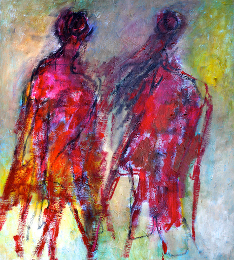 Door de verschillende lagen en kleuren over elkaar krijgt de acrylverf ook diepte. De gebruikte materialen zijn acrylverf op linnen.